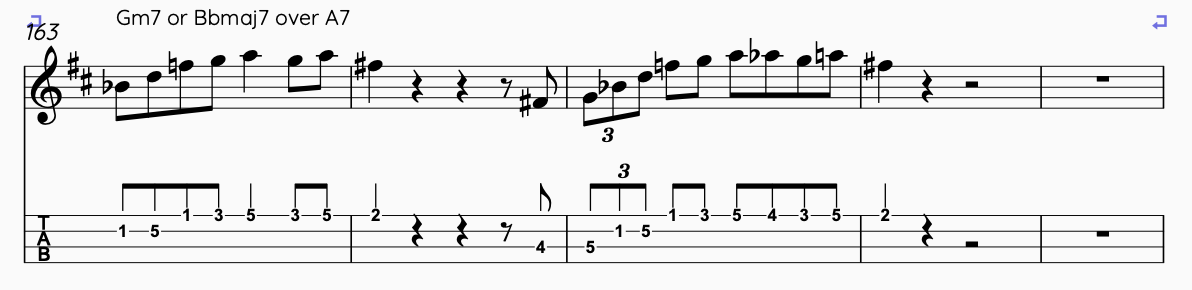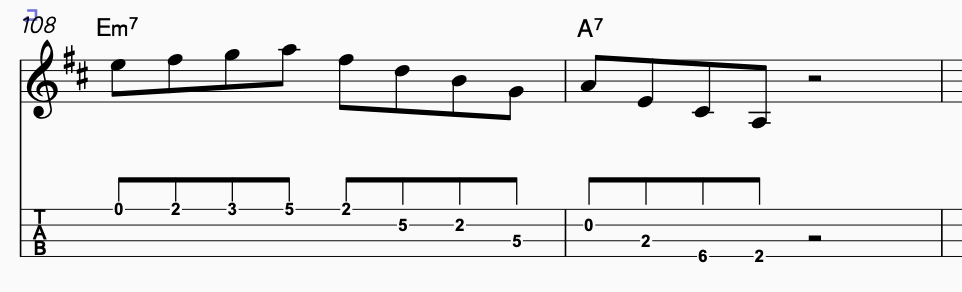 To learn jazz phrasing, we can’t just talk about it and explain it until we understand it— we have to play through many examples to absorb the language and style, ultimately building a vocabulary and deep understanding of the fretboard. So each tutorial not only comes with an explanation of the theory concept, but also many exercises or example phrases to play through, written in standard notation and tab. In the beginning we will set out to build a foundation, then each tutorial will add in more concepts and parts of the tune until we cover all of the chord changes. See attached examples of the exercises. (I will also provide video playing through each example phrase so you can hear and see how it’s done.)
